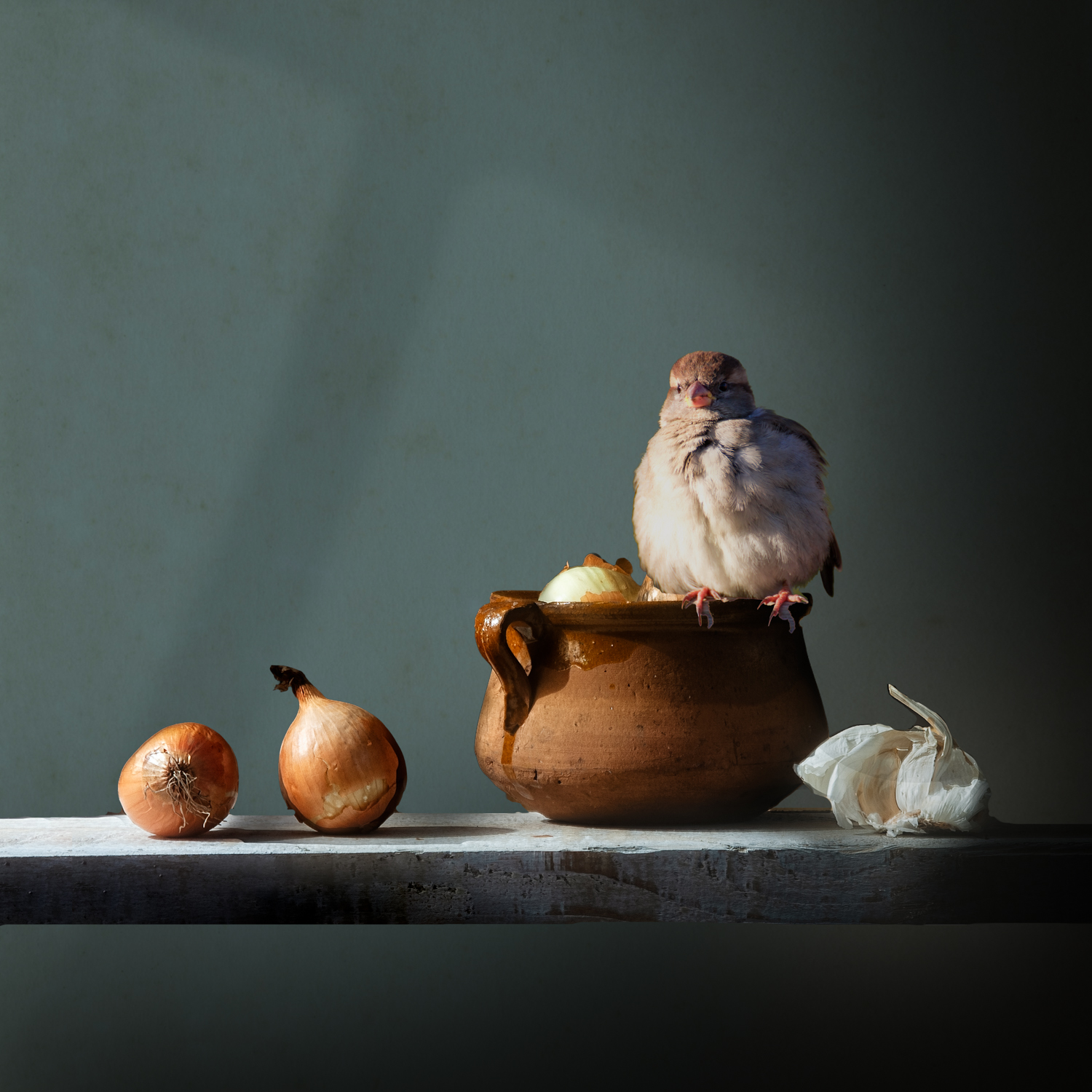 In dit werk gebruik ik dieren als levende elementen binnen geënsceneerde stillevens. Door menselijke objecten, humor, symboliek en natuur met elkaar te verweven, ontstaat een beeld dat zowel speels als vervreemdend is.