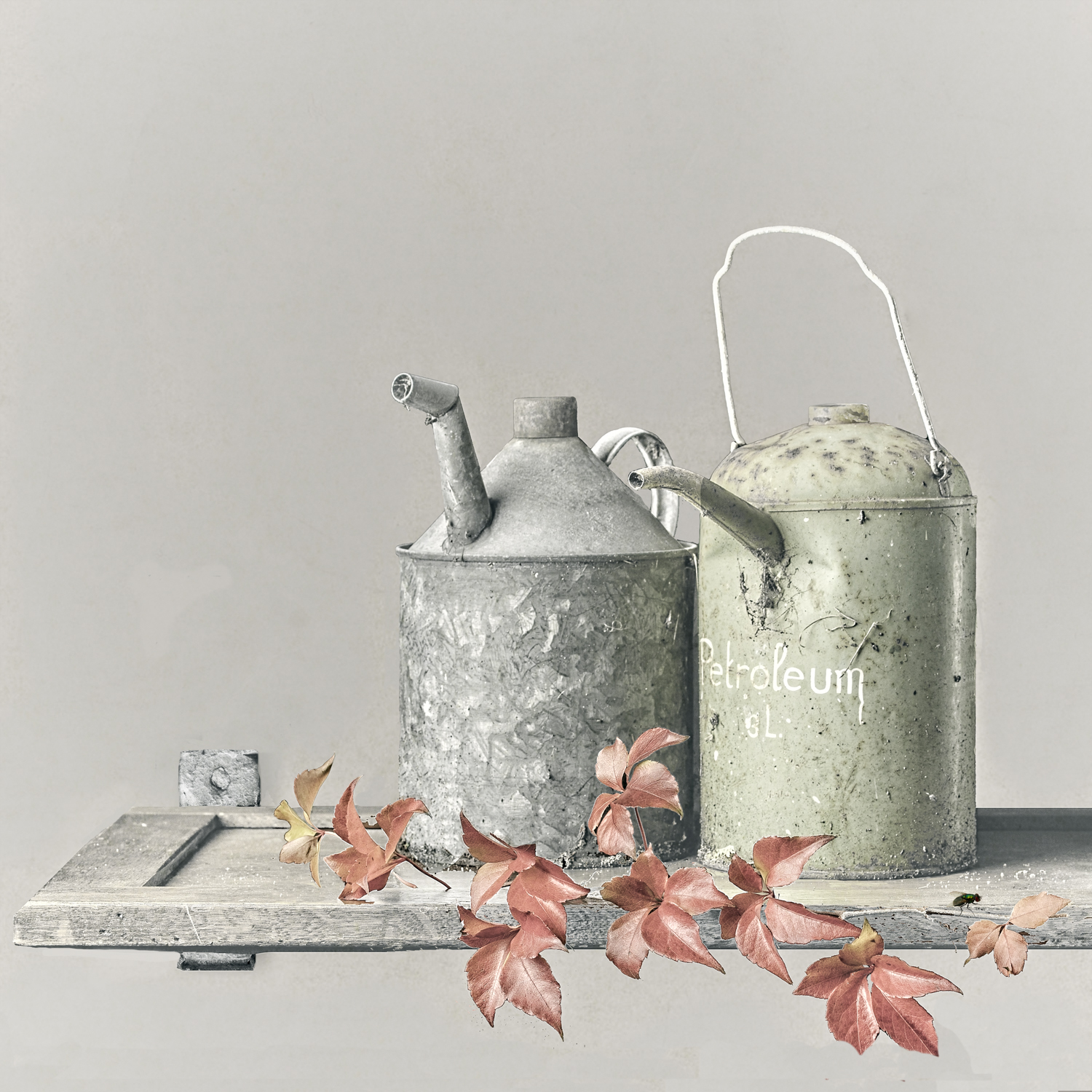 Soms heb ik een andere schilderachtige achtergrond toegevoegd of een wolkenlucht. Soms is er sprake van een humoristische twist of vervreemding. Zo heb ik in navolging van de 17de eeuwse schilderes Clara Peeters een miniatuurzelfportret in het stilleven met de zilveren theepot verwerkt. En mijn oog in het stilleven met de peer. Er is genoeg te ontdekken. Zijn het foto's of schilderijen?