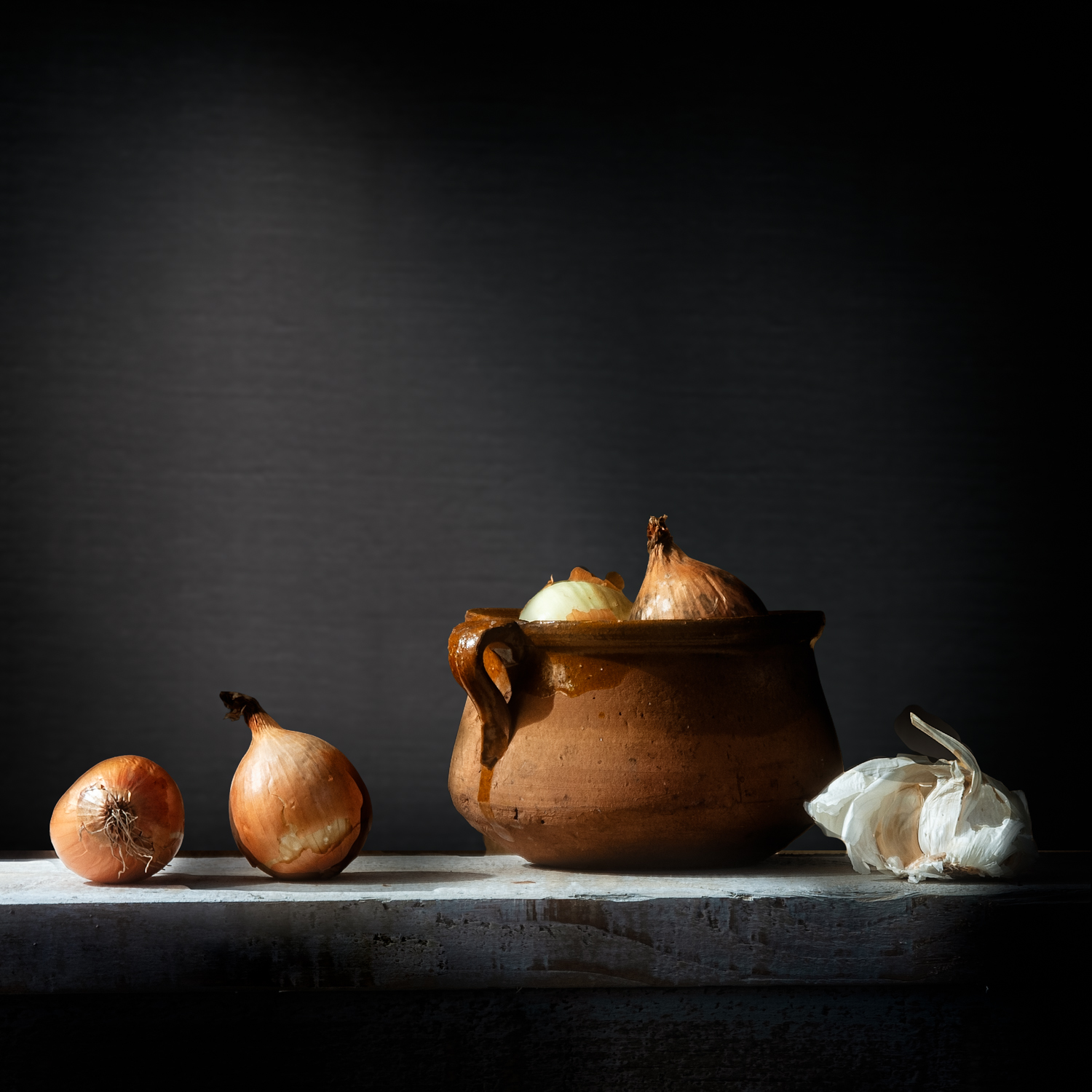 De clair-obscur techniek, ook wel chiaroscuro genoemd, draait het om het spel tussen licht en donker. Niet alleen om zo ergens de focus op te leggen maar ook voor een schilderachtig mysterieus effect. Gebruikt is 1 studiolamp, maar ook is soms gewerkt met een zaklantaarn.